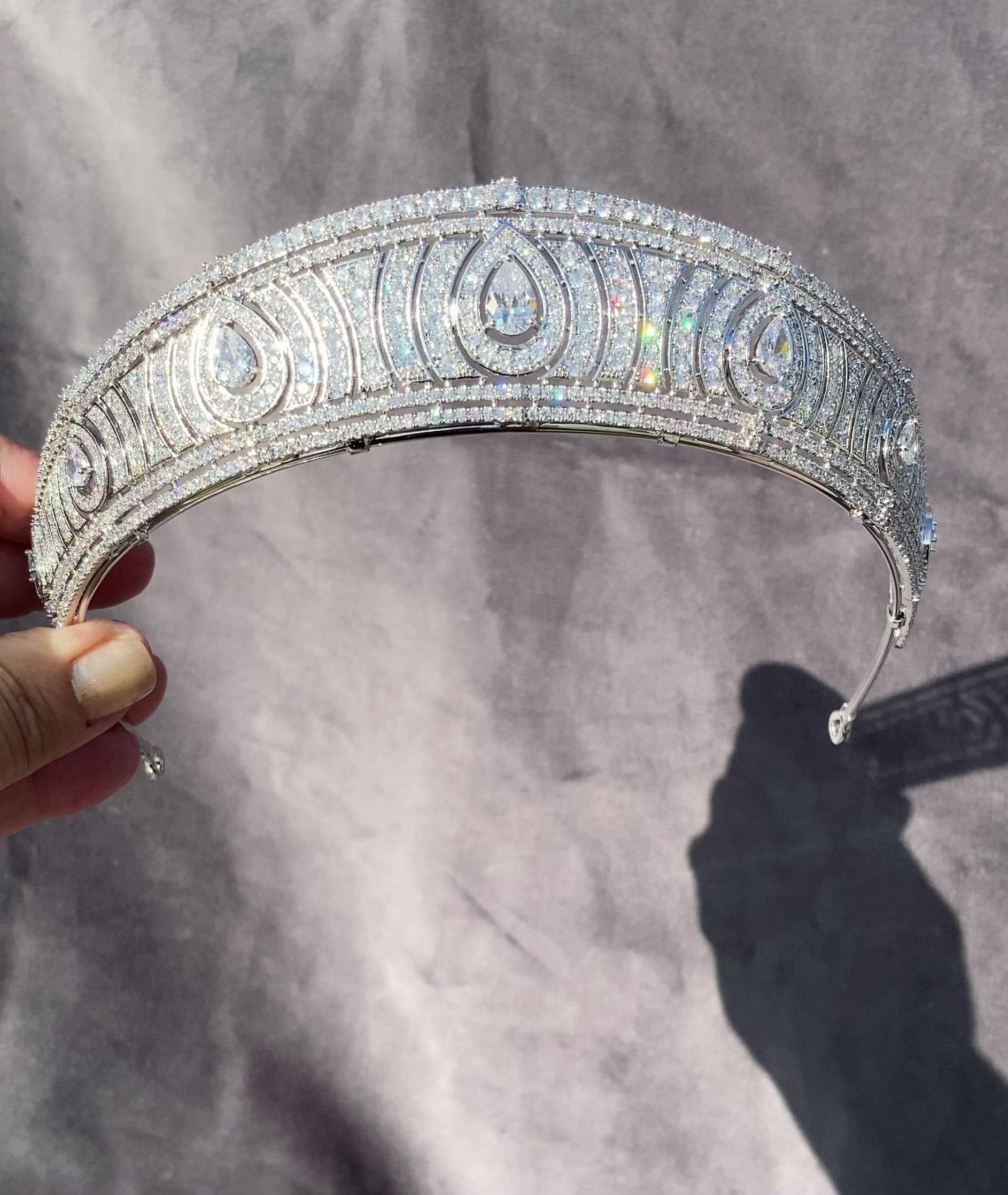 • An absolutely stunning Bandeau Tiara that exudes Royal Bride and sophisticated glamour. The pear shaped accents add even more elegance to this beautiful piece. Simulated Diamond Bridal Tiara with over 20 Carats of fine jewelry set AAAA+ Grade Flawless Cubic Zirconia Simulated Diamonds. Surely to become a treasured heirloom for future generations.