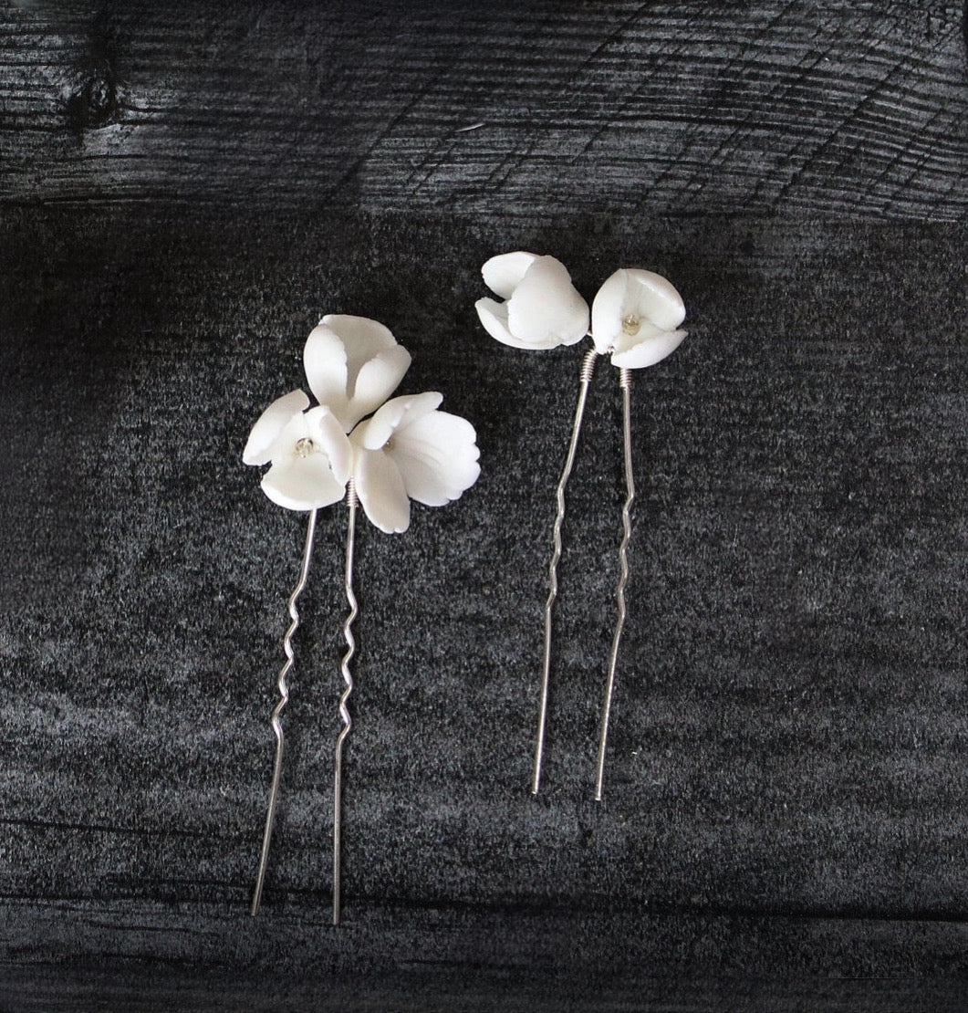 The Harper Combs and Hairpin Set is utterly romantic in it's simplicity... The delicate white porcelain blossoms are handmade and hand wired with glass bead accented centers, hand set atop 3 wire combs and 2 hair pins to adorn your tresses in a myriad of ways.