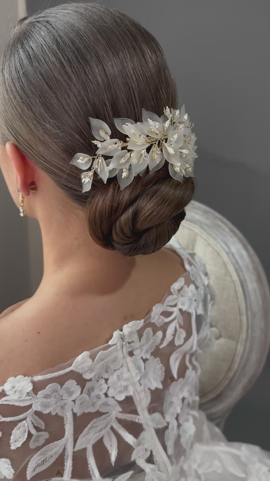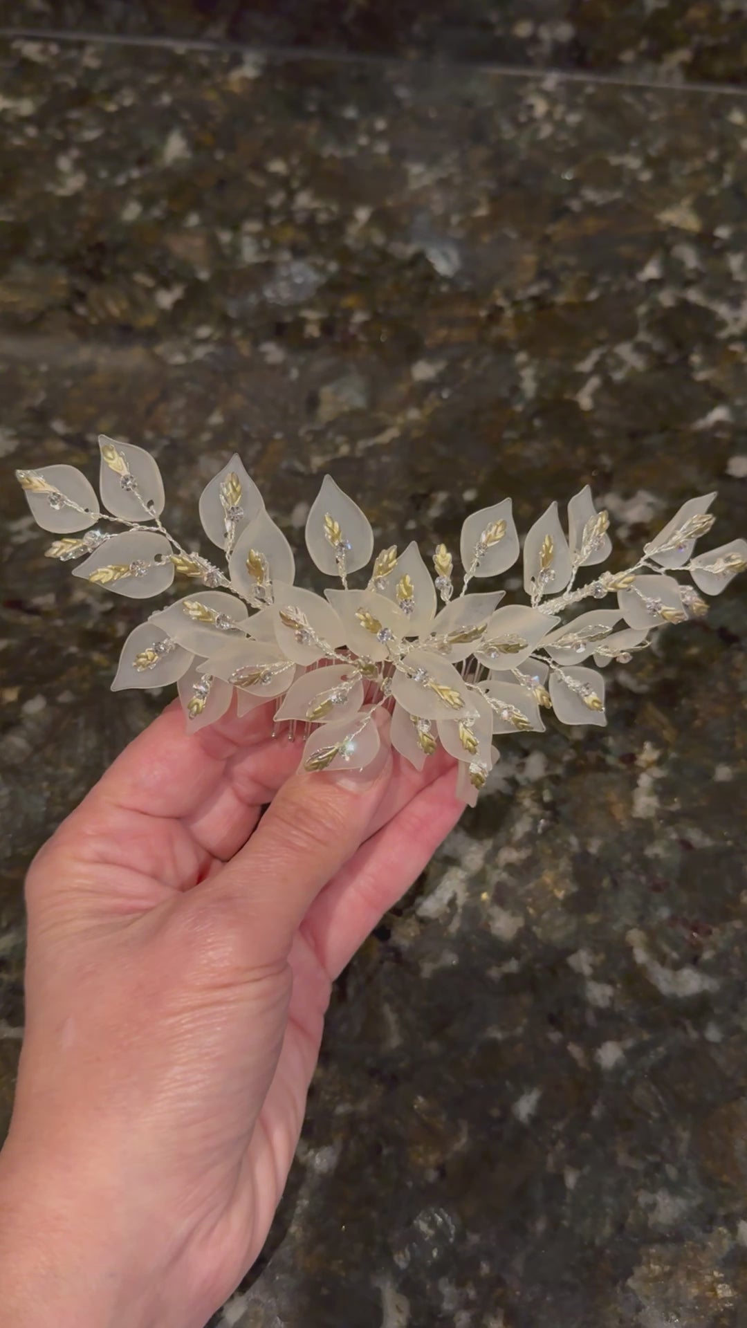 • Fine Austrian Crystals accenting leaf bud adorned lightweight acrylic leaves that give a romantic smoked glass effect while remaining a lightweight and easily wearable bridal hair comb.