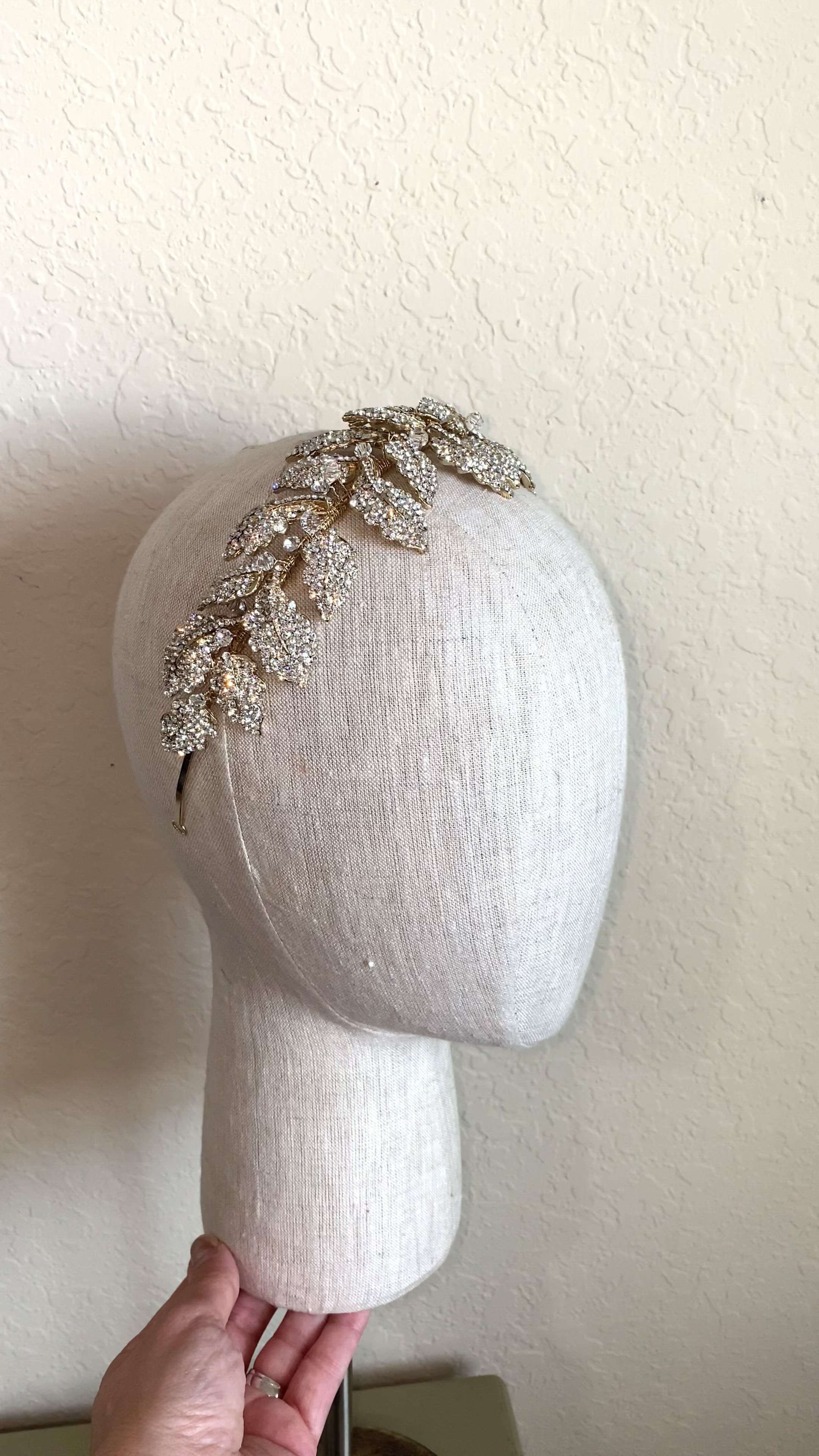 • Available in Silver and Gold, the LAUREL Headpiece Tiara is a show-stopping regal Bridal Tiara Headpiece... for the Bride having a Royal Wedding of her own... absolutely worthy of a Royal Ball. Hand set crystals that wind their way over and accent the leaves are just exquisite!