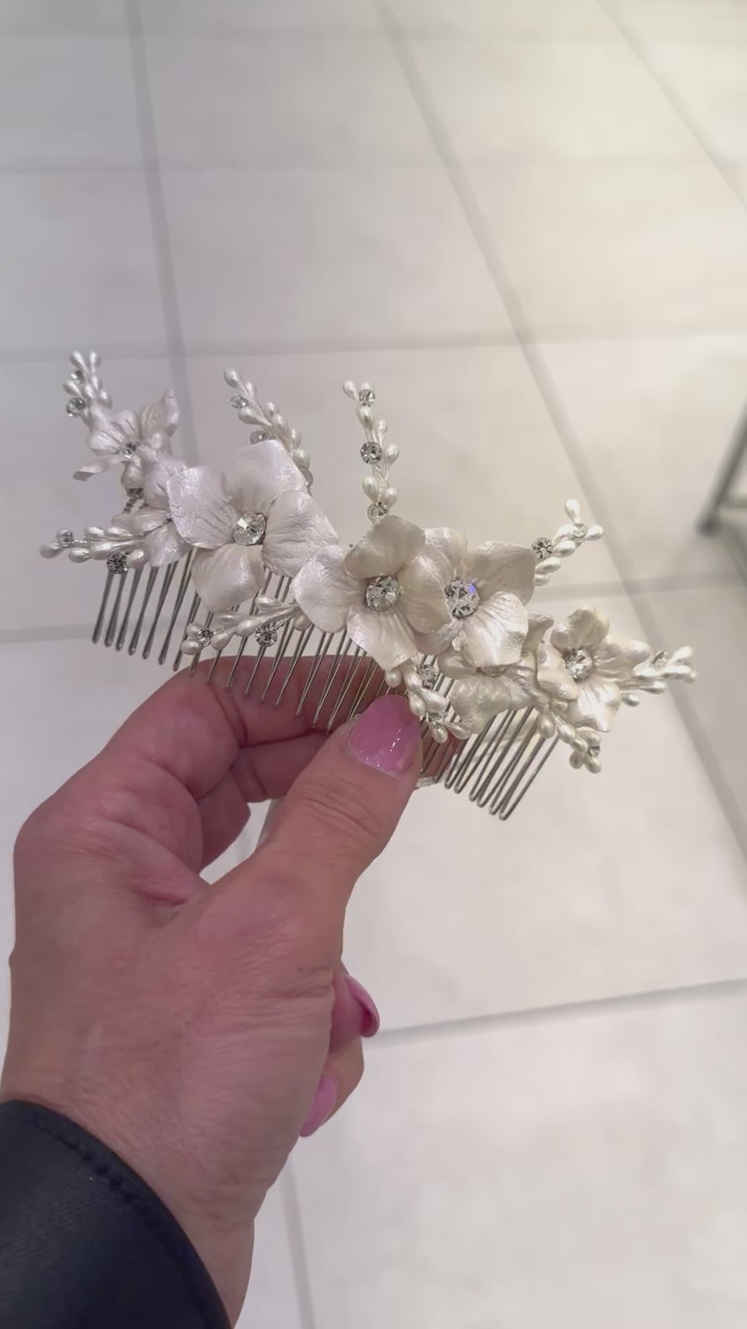• The Olivia Headpiece is a beautiful hair comb spun of creamy pearlized branches, faux leather blossoms, and fine crystal accents.