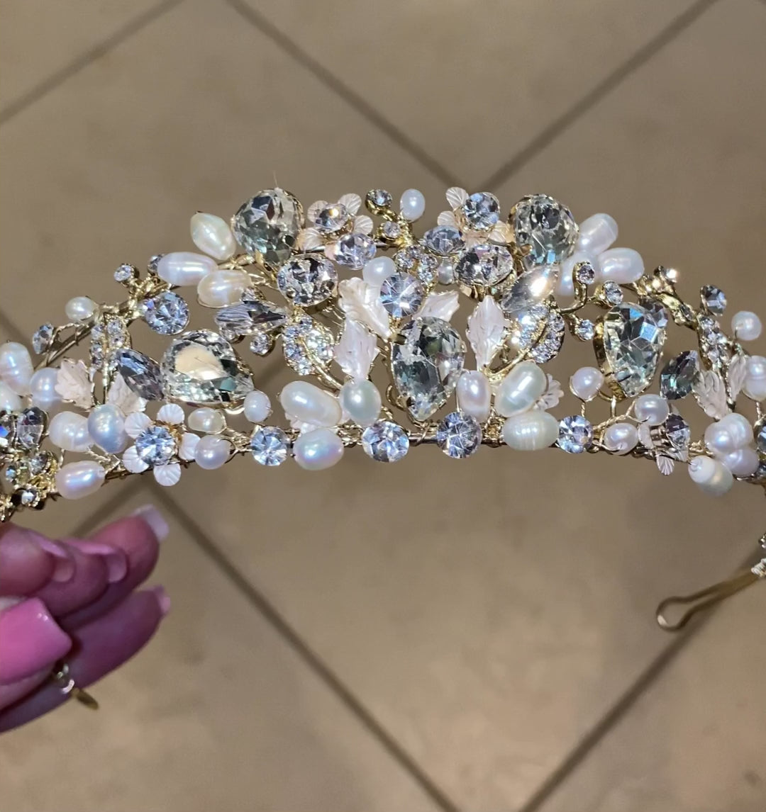 • Please note: Current upgraded version is made with freshwater pearls replacing the faux wax flower buds as shown in older versions of tiara. The tiara otherwise is exactly the same. The video at the end and Rose Gold version shows the upgraded pearling instead of the faux wax buds.